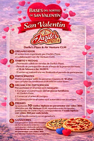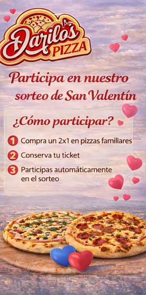 Pide tu 2X1 de pizzas familiares en cualquier tienda Darilo´s y participa automáticamente. SORTEO 16 FEBRERO.